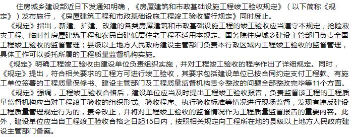 住房城鄉(xiāng)建設(shè)部近日下發(fā)通知明確,《房屋建筑和市政基礎(chǔ)設(shè)施工程竣工驗收規(guī)定》(以下簡稱《規(guī)定》)發(fā)布施行,《房屋建筑工程和市政基礎(chǔ)設(shè)施工程竣工驗收暫行規(guī)定》同時廢止。