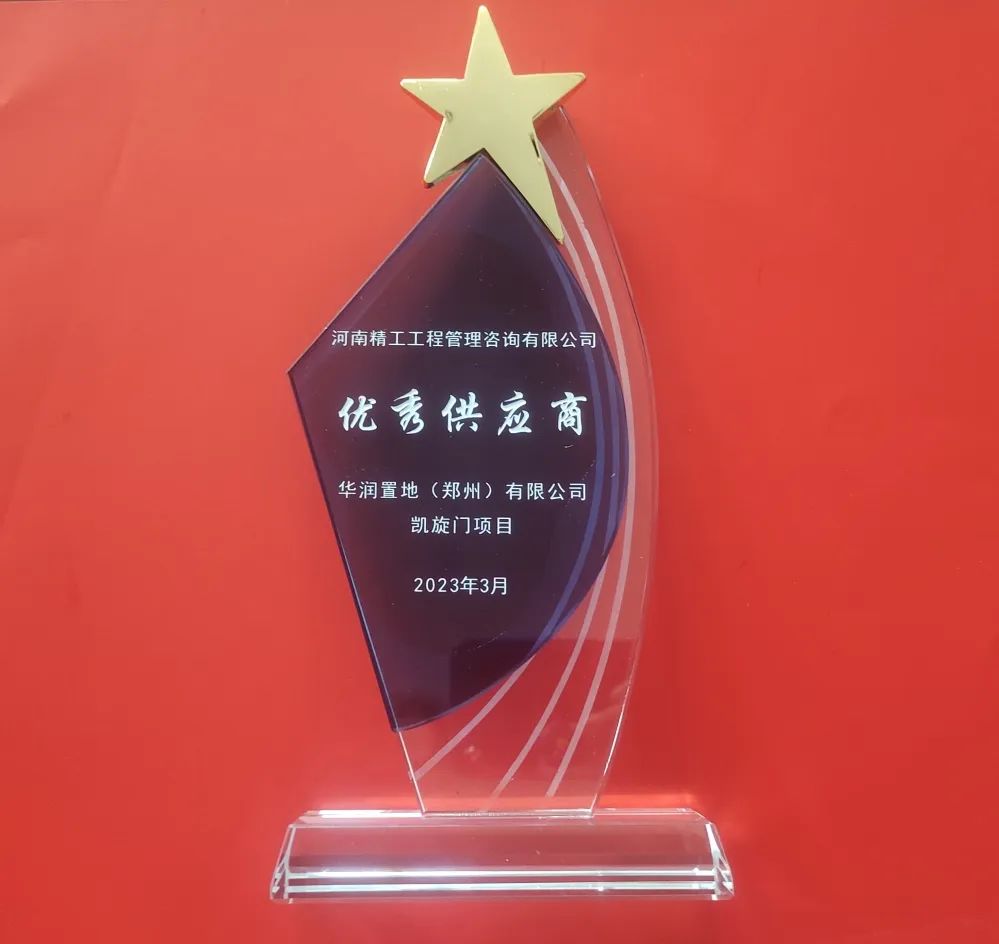 2023年4月17日,河南精工工程管理咨詢有限公司繼獲得華潤置地(鄭州)有限公司凱旋門項目部頒發2022年度“優秀供應商”后,時隔101天再度榮獲2023年度“優秀供應商”稱號。