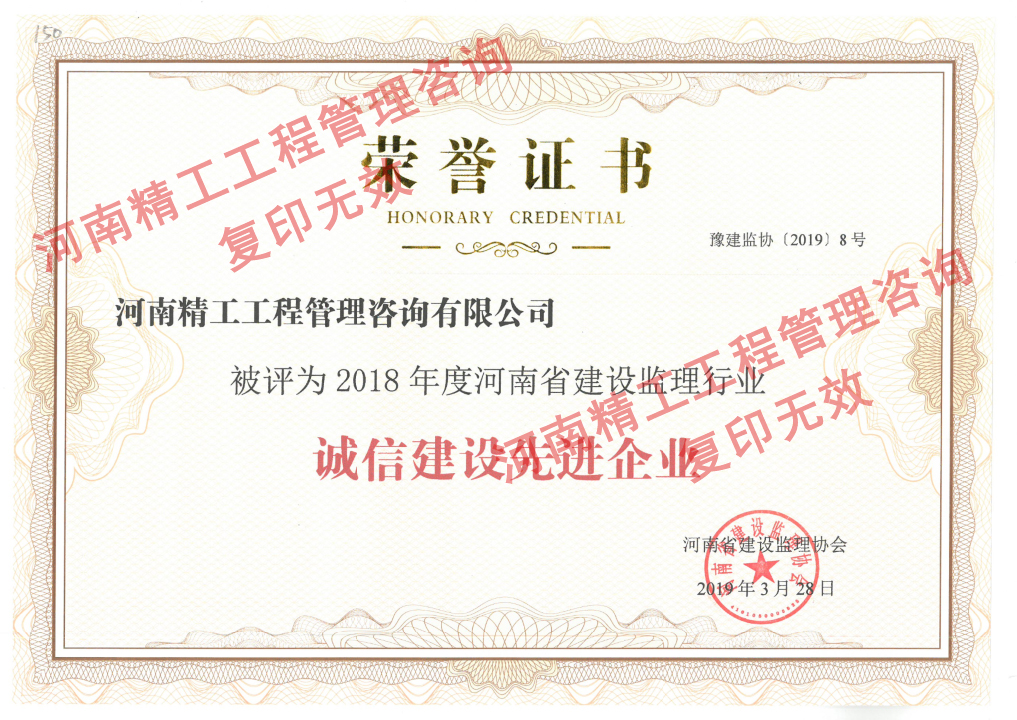 河南精工工程管理咨詢有限公司一直秉承“ 誠以致信,踐以施行”的企業(yè)精神,為合作伙伴提供高品質的工程監(jiān)理服務,同時也得到了社會各界,同行,業(yè)主單位的認可,公司至成立以來,連續(xù)多年獲得此項榮譽。